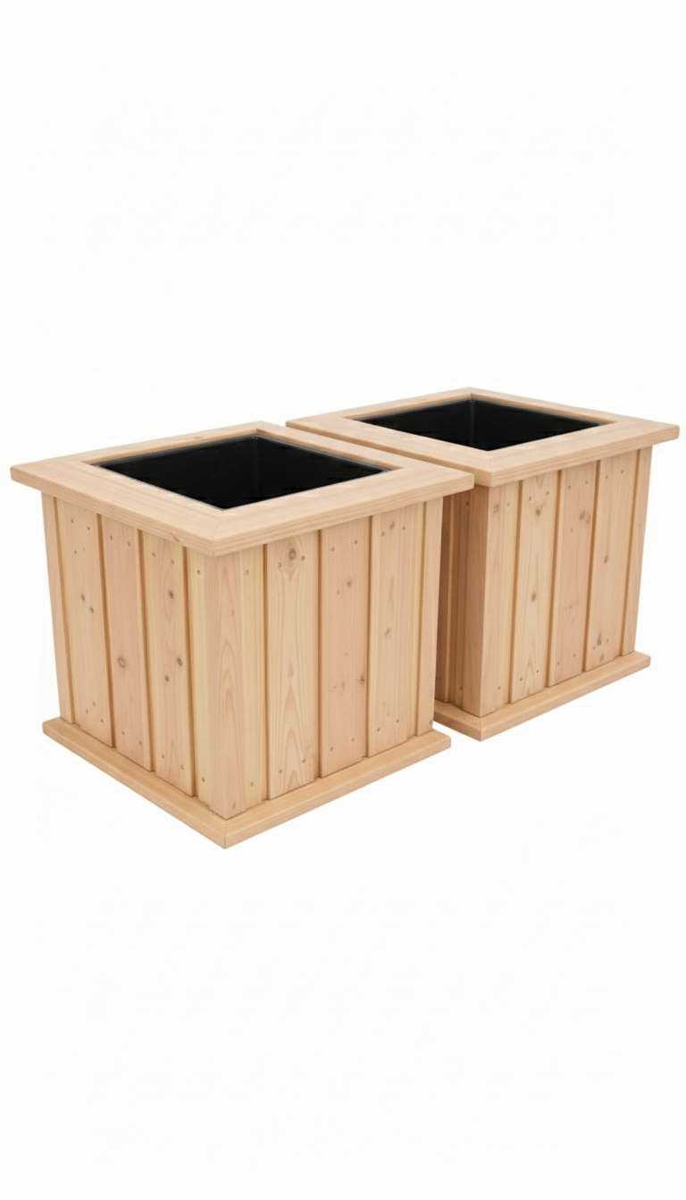 Chique bloembak, compleet van Douglas hout en inclusief kunststof inzetbak met handgrepen