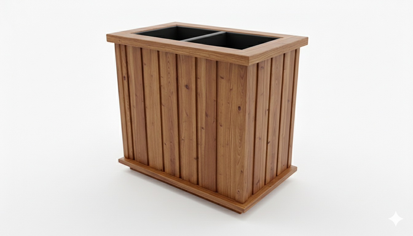 Chique bloembak, compleet van Douglas hout en inclusief 2 kunststof inzetbakken met handgrepen